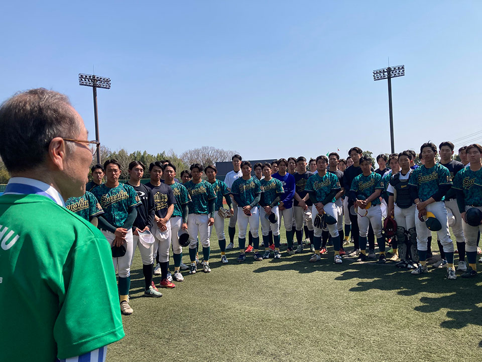 ■2025年3月23日 専修大学グラウンドで行われたオープン戦を応援し、激励いたしました。2025年は野球部の創部100周年の記念すべき年になります。